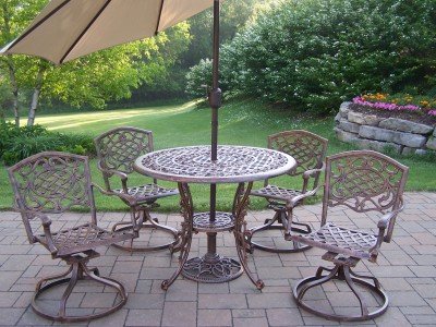 Oakland Living Mississippi Cast Aluminum 5pc Swivel Dining Set with Tilting Umbrella and Stand Features